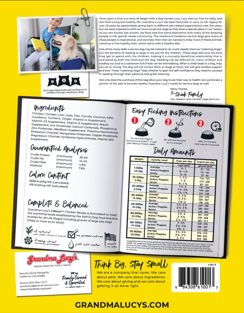 Freeze-dried dog food easy to prepare, nutritious, complete and balanced meal or a great snack for your pup. Just add water to our grain-inclusive Grandma Lucy's 3 Bears Chicken and watch it transform into a hearty, oatmeal-like consistency within minutes. Packed with chicken and chicken liver and featuring a blend of super food ingredients including flax, coconut, kale, and cranberries. Shelf stable, lightweight, and preservative free. Fresh, wholesome nutrition made simple that will keep your pups bowl licked clean!