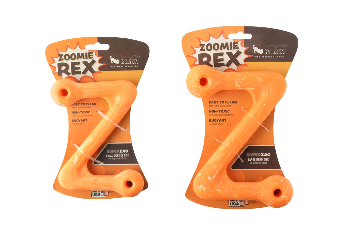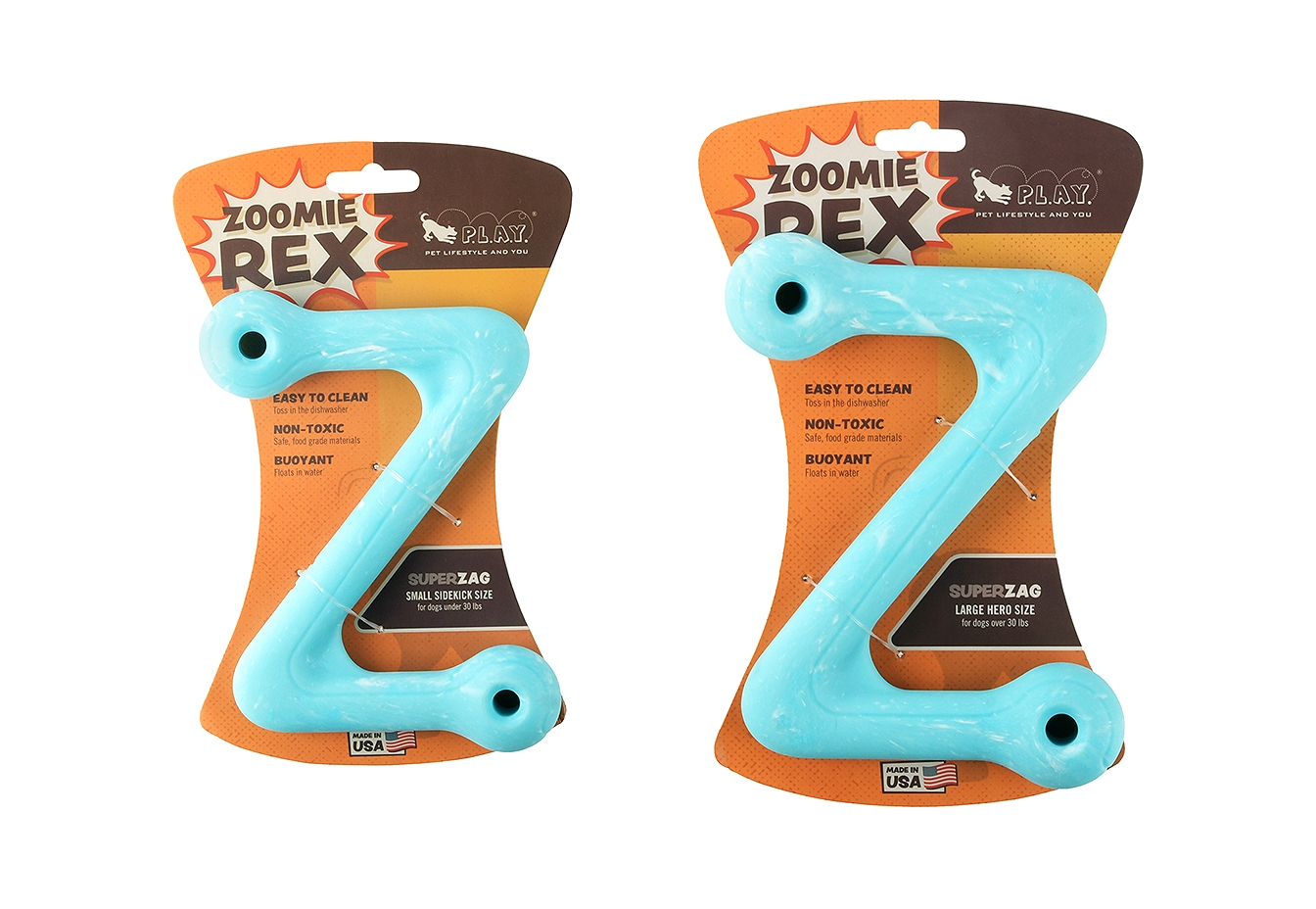 Calling all canine crusaders! P.L.A.Y.’s ZoomieRexTM SuperZag is here to unleash epic playtime powers with its dynamic Z-shape. This tough toy is perfect for gripping, tugging and chomping like a true hero. This toy is built to withstand villainous chews and is ready to soar through games of fetch, standing firm in every battle with its super-strong and non-toxic material. Whether on land or sea, the SuperZag toy is always ready for action.