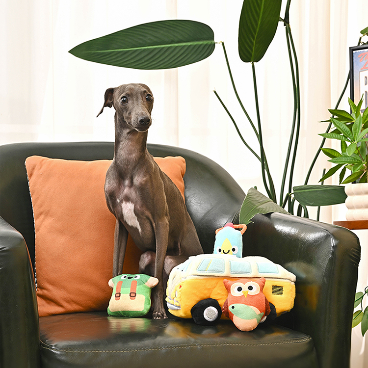 Hit the road to fun with this officially licensed Volkswagen Camper Van dog toy. This hide-and-seek toy comes with three squeaky plush toys for pups to dig out. You can also hide treats in the van to keep playtime exciting and interactive. Perfect toy to keep pups busy for hours.