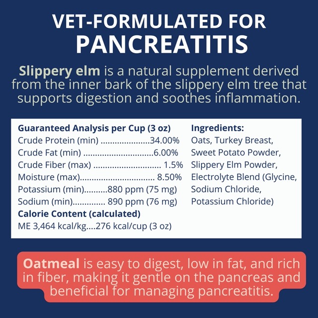 This oatmeal and turkey-based formula with slippery elm is perfect for dogs with pancreatitis or allergies, offering easy-to-digest, low-fat ingredients....