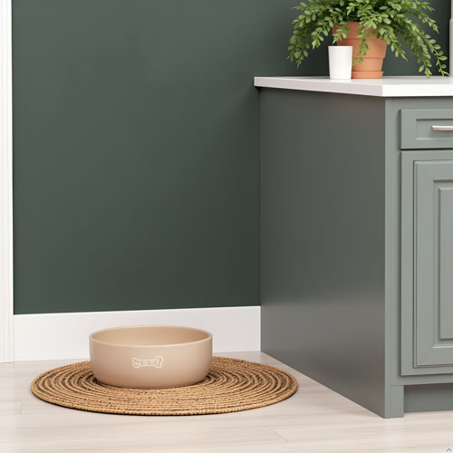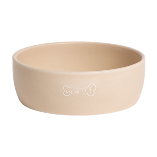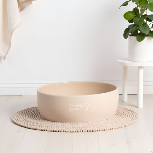 Pearhead’s Ceramic Woof Dog Food Bowl in neutral taupe with “woof” script combines style, function, and durability to make mealtime simple and mess-free.