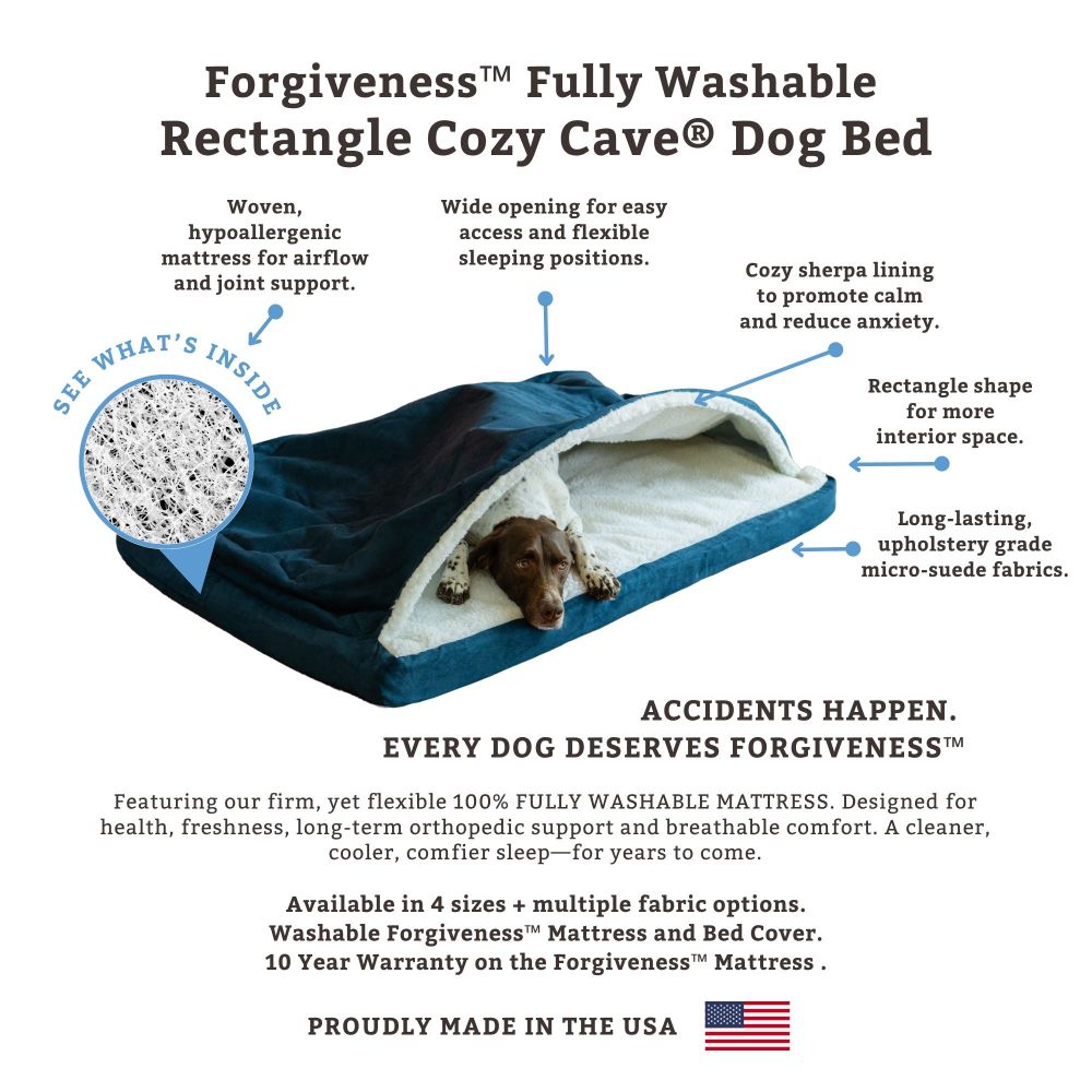 You asked. We listened. Our best-selling Rectangle Cozy Cave™ just got a revolutionary upgrade — and it’s unlike anything else on the market. Introducing the Rectangle Cozy Cave™ with Forgiveness™ Foam — the first orthopedic dog cave bed with a fully washable mattress. That’s right. From the microsuede cover to the orthopedic core, every inch of this bed is designed to be cleaned, refreshed, and restored — without compromising comfort. With 12.5 square feet of sleep surface, this bed is made for big dogs, multiple dogs, or dogs that simply like to spread out. But more importantly, it’s made for dogs who need support, and pet parents who need solutions. The Forgiveness™ mattress is breathable, resilient, and engineered to help ease joint pain — all while resisting odors, allergens, and bacteria. Whether your pup is house-training or entering their golden years, this bed was made to restore comfort and dignity. And with a 10-year warranty on the mattress, it just might be the last bed you’ll ever need to buy. "NOBODY else sells anything like it... It’s one of the most remarkable innovations in pet care that we’ve found." — Forgiveness™ customer, Three Spaniels Like A Hug For Your Dog! Is your dog a cuddler? A snuggler? A burrower? Then the Cozy Cave dog bed is just what you're looking for! The hooded dog bed design lets your dog snooze between layers of soft Sherpa lining for the ultimate in enveloped comfort and coziness. The removeable tubing in the hood lets you remove the tubing the hood for a looser, "blanket-like" structure or keep inserted for a tighter fit for an open "cave-like" feeling to suit your dog"s preferences. Sleeping in the Cozy Cave is the next best thing to sleeping next to you, and your dog will love it! Calmer, Happier Dogs. Made to appeal to a dog's natural instincts for burrowing, the Cozy Cave is the best dog bed for dogs who love sleeping under blankets or prefer to spend time in their own little "den". Our dog cave bed gives them a place of their own to relax with a feeling of safety and security for less anxiety and more restful sleep. Best In Class. The Cozy Cave is the best-in-class dog cave bed on the market, with 1000's of 5-star reviews from happy customers!