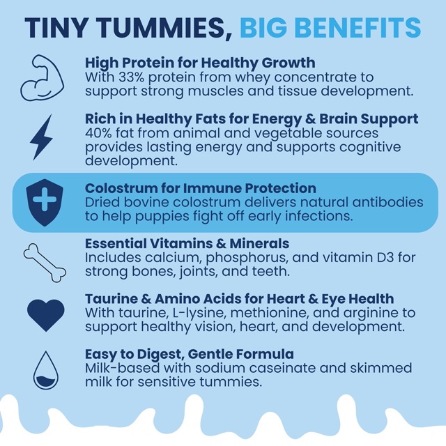With Colostrum for Immune Support: Fortified with dried bovine colostrum, a rich source of natural antibodies and immune-boosting compounds to help protect vulnerable puppies as their immune systems develop.