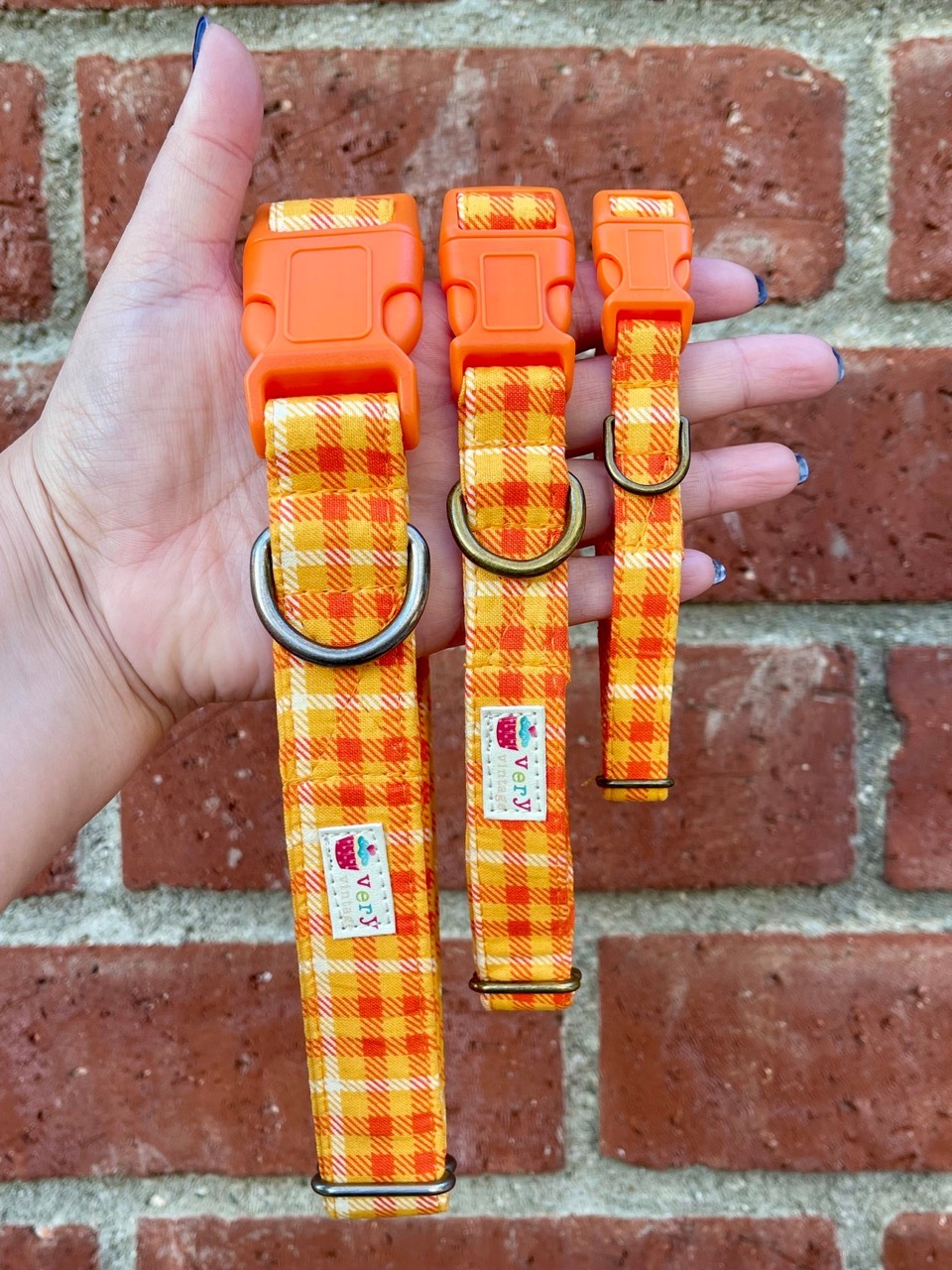 Festive Orange & Yellow Tartan Pattern. Organic Cotton Dog & Cat Collars & Leashes. Eco-Friendly. Handmade in Los Angeles.