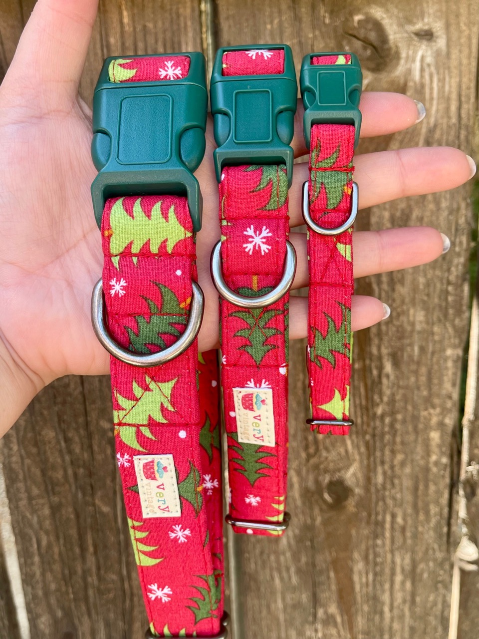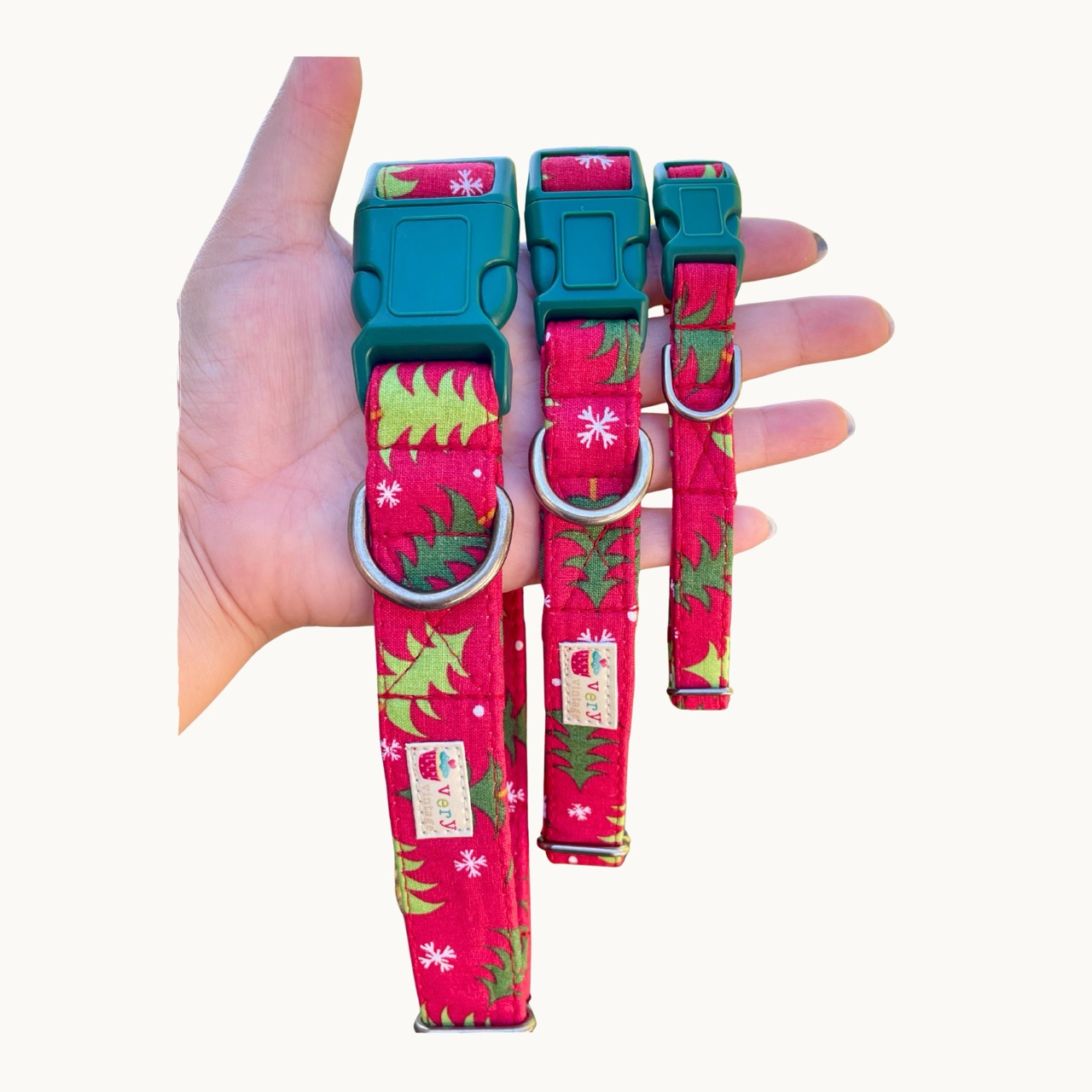 Red Christmas Tree Pattern. Organic Cotton Dog & Cat Collars & Leashes. Eco-Friendly. Handmade in Los Angeles.