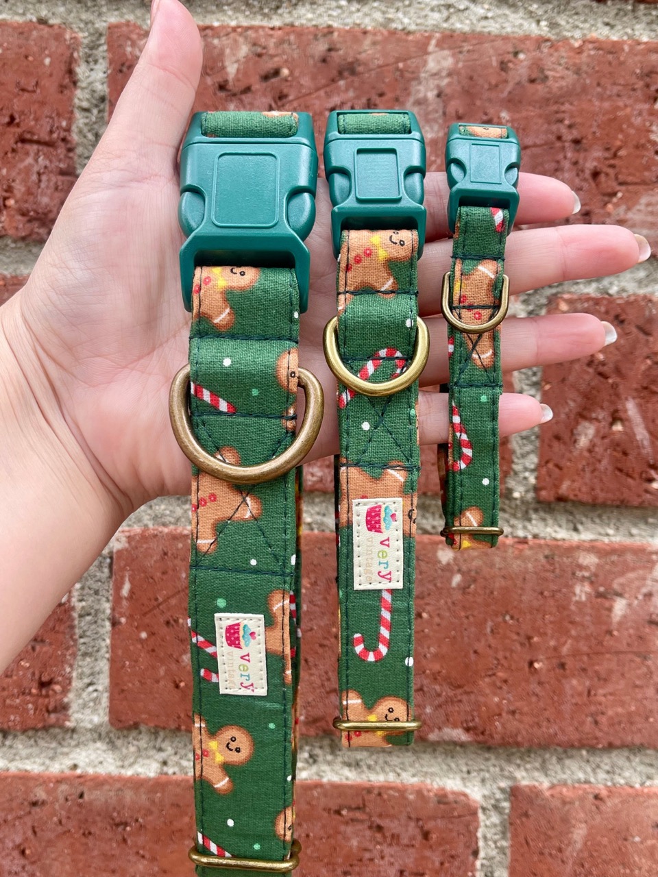 Festive Gingerbread Man Pattern. Organic Cotton Dog & Cat Collars & Leashes. Eco-Friendly. Handmade in Los Angeles.