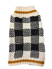 A bold plaid style sweater in gold and white. Item is 100% acrylic and dry clean only is suggested for proper care.
