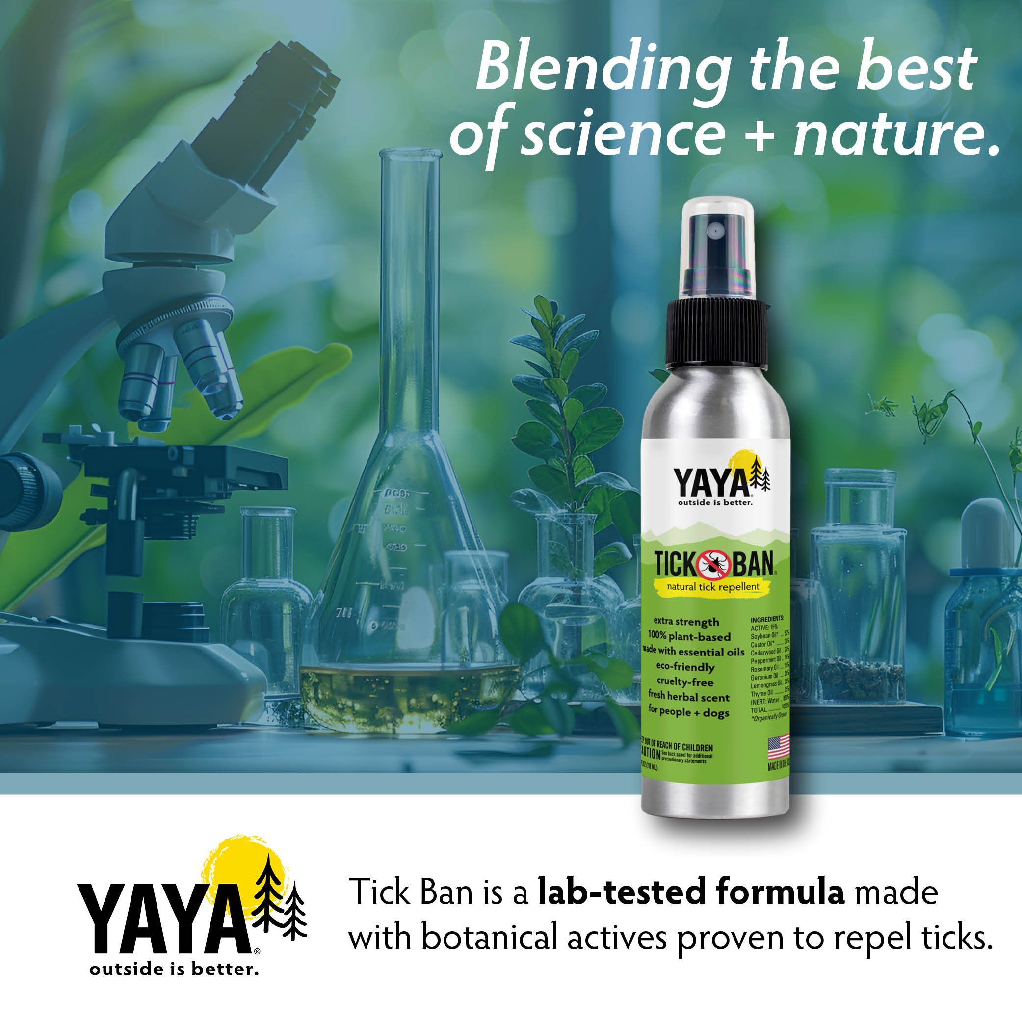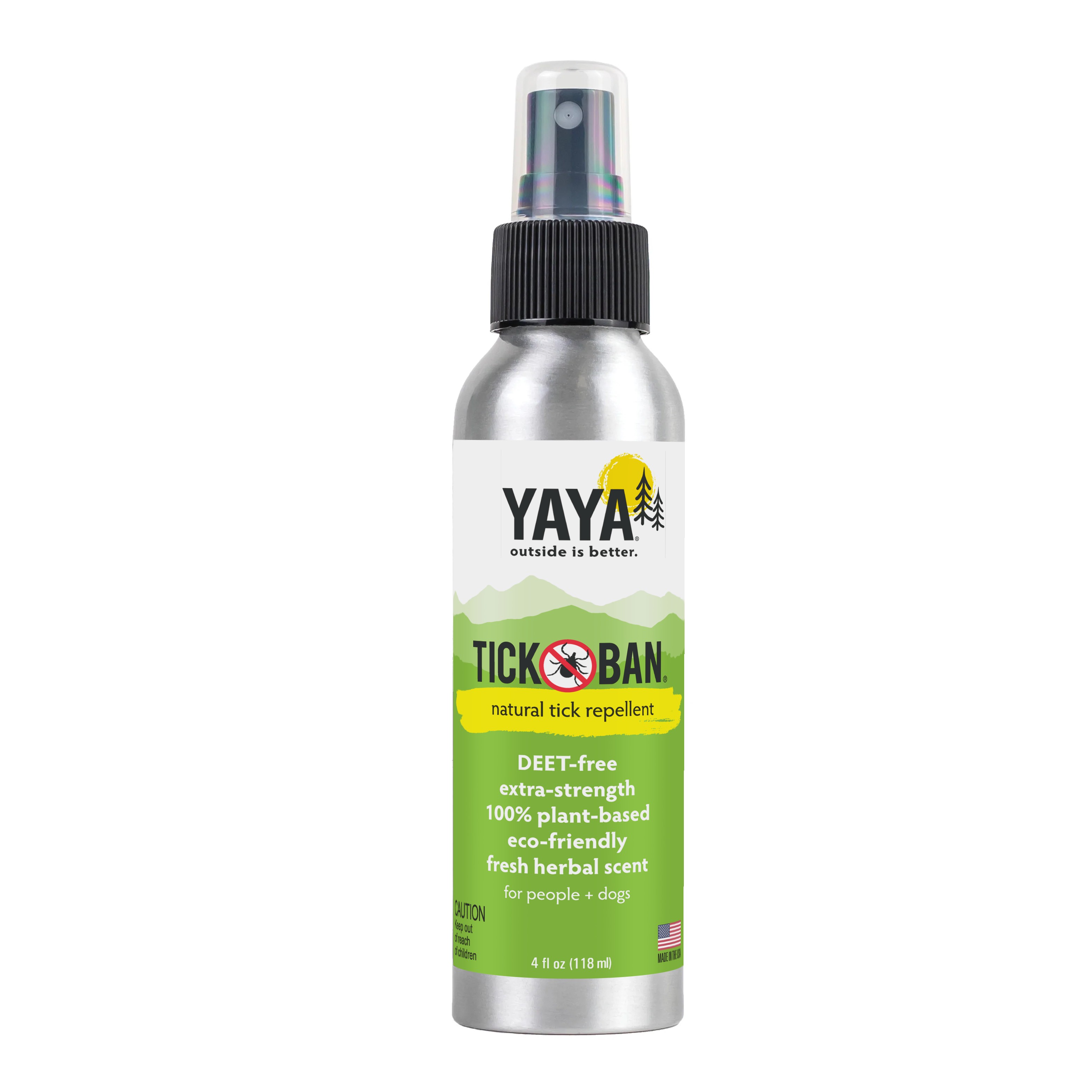 TICK BAN® the original plant-based tick repellent, made with eco-friendly ingredients you can trust. Effective for people, dogs and horses! Serious bug protection without the chemicals! Extra potent formula. 100% plant-based, pure, all-natural, non-toxic, deet-free, insect-specific for targeted performance. Made with a special blend of essential oils that people love & ticks hate including cedar, peppermint, thyme, geranium. Safe for the whole family, including dogs! (when used as directed). Eco-Friendly alumiminum packaging. Available in multiple sizes 4 oz, 8 oz and 16 oz and refills. Choose YAYA, your go to choice for Healthy, Eco-Friendly Sun and Bug products.