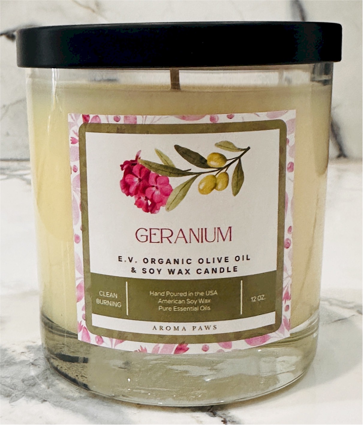 Egyptian Geranium Rose Essential Oil in an Extra Virgin Olive Oil and Soy Wax Clean Burning Candle. Hand poured in 12 oz. glass jar with lid. Approximate burn time 90 hours.