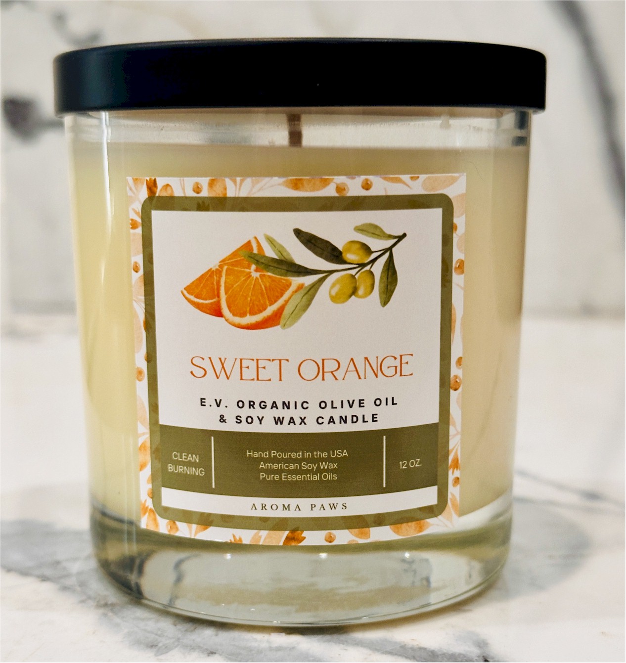 Sweet Orange Essential Oil in an Extra Virgin Olive Oil and Soy Wax Clean Burning Candle. Hand poured in 12 oz. glass jar with lid. Approximate burn time 90 hours.