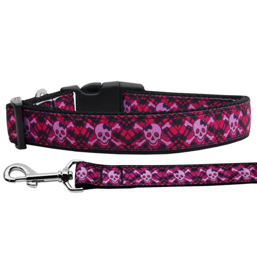 Pet Dog & Cat Nylon Collar or Leash, "Hot Pink Plaid Skulls"