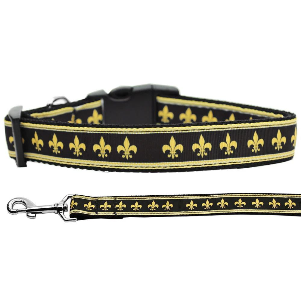 Pet Dog and Cat Nylon Collar or Leash, "Black & Gold Fleur De Lis"