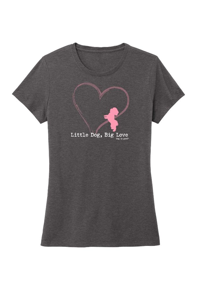 Some of the biggest hearts come in the smallest packages. Celebrate the big love of your little dog with Dog is Good's "Little Dog, Big Love" women's t-shirt. Featuring a cute pink