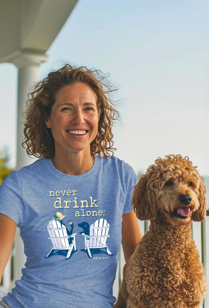 Introducing our "Never Drink Alone" women's t-shirt - perfect for those who understand that good times are best enjoyed with a loyal companion by your side. This beautiful blue, V-neck t-shirt is a fun and fashionable reminder that you're never alone with Dog. Made from a soft spun cotton blend, it's designed for both style and comfort.