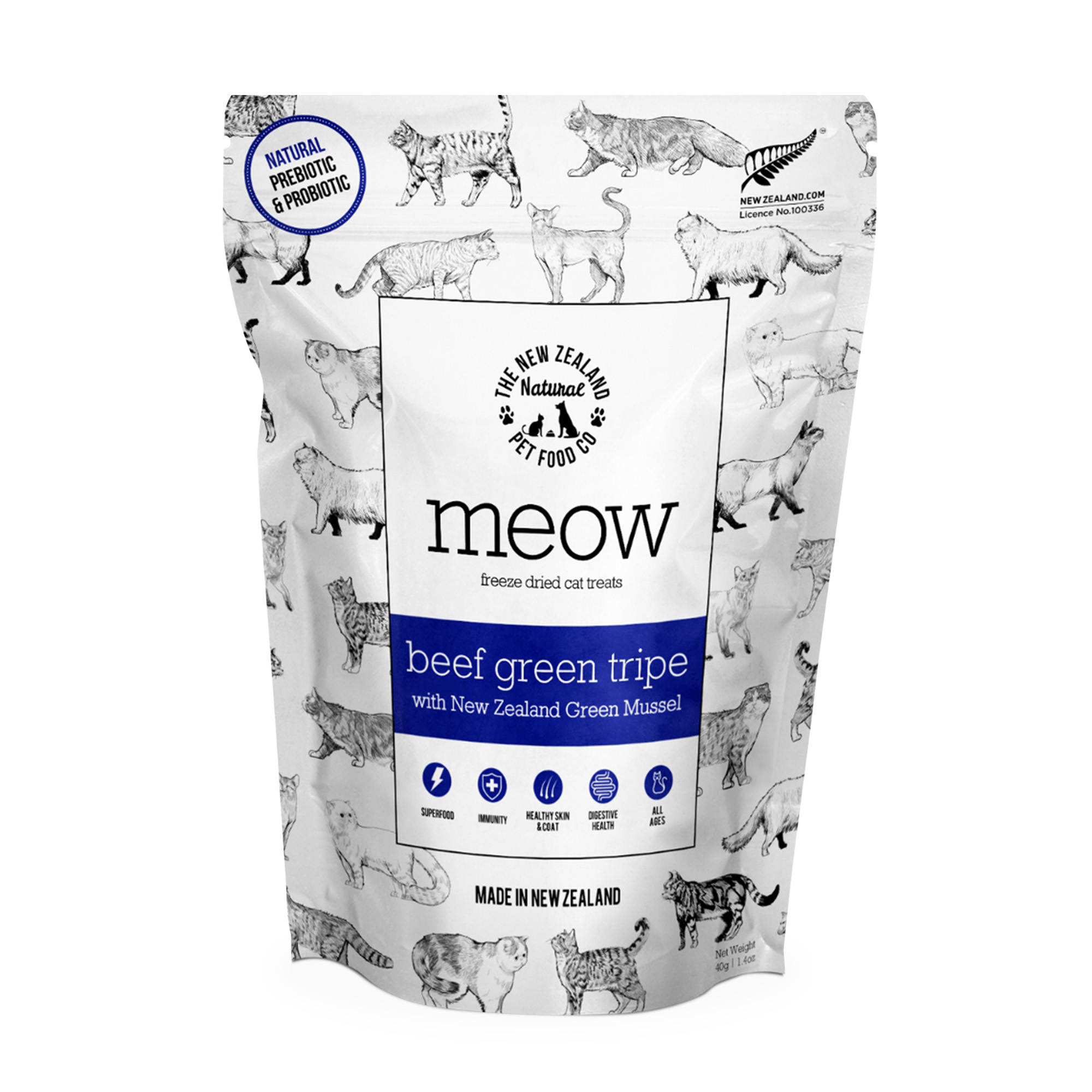 MEOW Beef Green Tripe w/ NZ Green Mussel Treats are a healthy, protein rich treat.