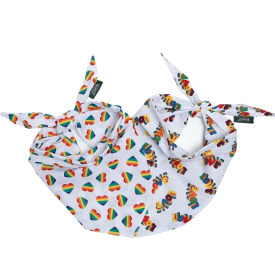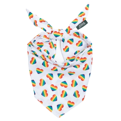 Pride Hearts - let your furry friend shine in style with this Pride Hearts Dog Bandana featuring an adorable rainbow heart pattern.