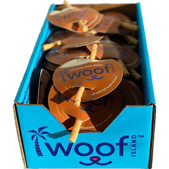 The kit includes the merchandising box and 24 single unit Woof Island Original Flavor Coconut Twists. Best of all, the entire kit is FREE with a purchase of $200 or more (limit one per store).