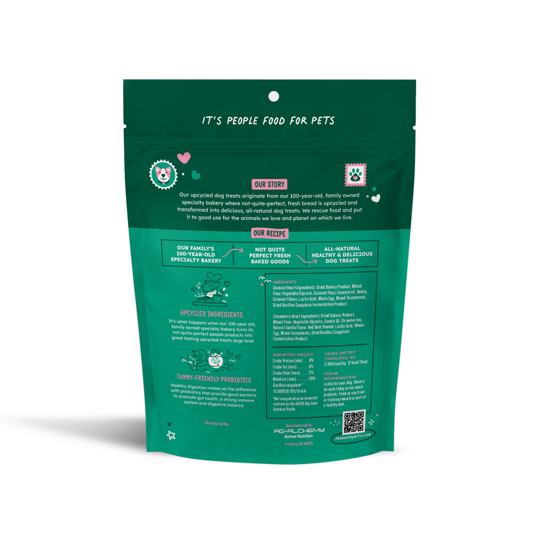 Strawberry Heart Ingredients: dried bakery product, wheat flour, vegetable glycerin, canola oil, strawberries, natural vanilla flavor, red beet powder, lactic acid, whole egg, mixed tocopherols, dried bacillus coagulans fermentation product.
