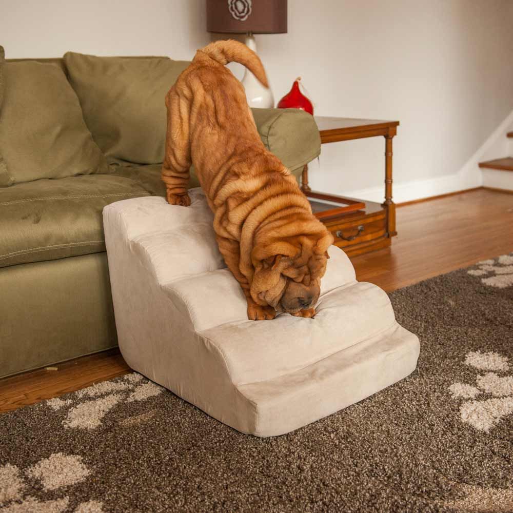 *EXCELLENT FOR SMALLER DOGS AND OLDER DOGS. Hopping up onto the sofa or bed can be tough for little dogs and downright dangerous for older dogs, who may lose their footing and injure themselves. Dogs with bone, joint, and mobility issues and dogs who have recently had surgery may not even try to join you on the bed or couch because it hurts too much. Our scalloped dog stairs solve this problem by allowing your dog to get on and off the furniture in a safe, easy, and pain-free way. Your dog will be able to get where they need to go without your help every time, and you can have peace of mind that they’ll be safe doing so. *SPEND MORE TIME TOGETHER. With a wide base and made of firm foam, our scalloped dog stairs are stable and the Large size can accommodate dogs up to 100 pounds. And the lightweight foam means it’s easy to move around the house as needed. So no matter where you are, your dog can spend more time right by your side, where you both want to be. *STYLISH AND EASY TO CLEAN. Our scalloped dog stairs come with a microsuede cover that’s soft to the touch and prevents slipping. It’s machine washable, too, so you can easily keep it clean. With six colors to choose from to fit in with your décor, these dog stairs aren’t just functional, but look great so you can have them in any room of the house.