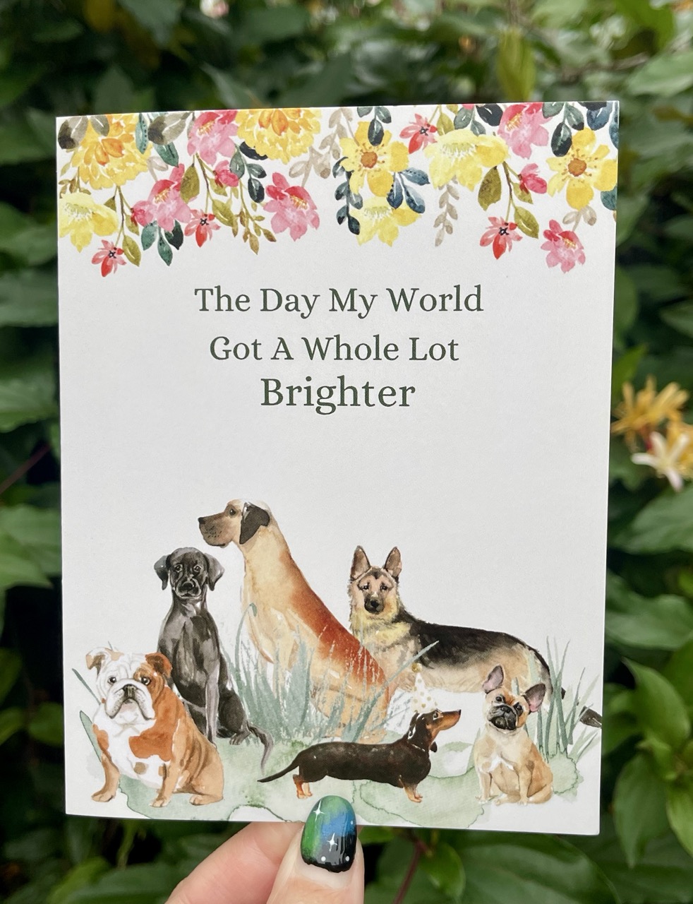 Celebrate the moment a world got "a whole lot brighter" with this vibrant, hand-created "Gotcha Day" and Birthday card. Designed with a Very Vintage aesthetic, this card features a lush watercolor floral canopy and a charming group of popular breeds - including a German Shepherd, French Bulldog, English Bulldog, Black Lab, Great Dane and a Dachshund in a party hat.