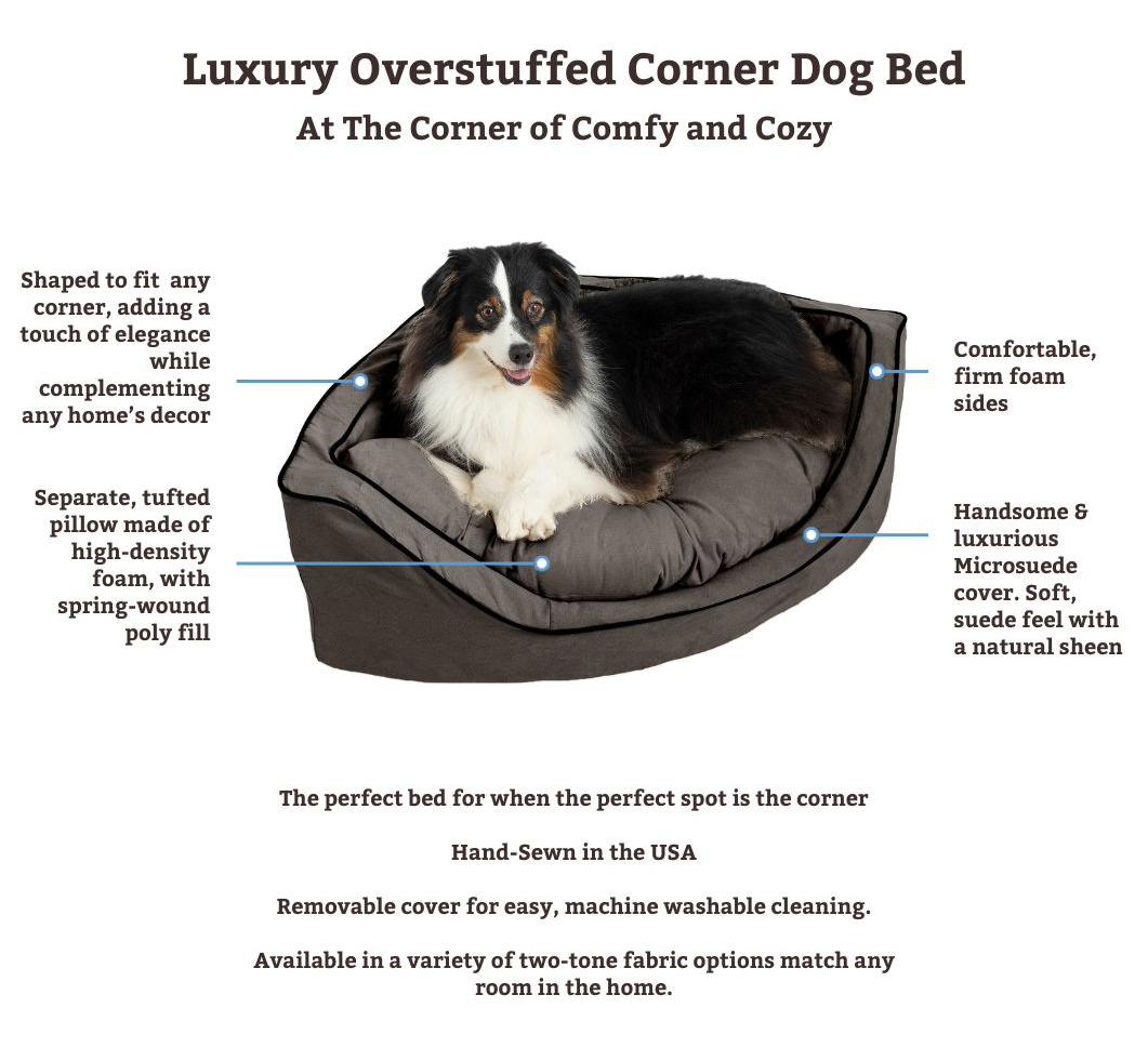 At The Corner Of Comfy And Cozy. When the perfect spot is in the corner, Snoozer has the perfect bed. The Snoozer Luxury Corner Bed is an ideal place to let sleeping dogs lie. Luxurious, machine-washable microsuede fabric adds a touch of elegance while complementing any home’s decor. The Luxury Corner bed is sure to provide long-lasting comfort. Made of high-density foam, a separate, tufted pillow with spring-wound poly fill is difficult for dogs to resist. Available in a variety of two-tone fabric options match any room in the home.