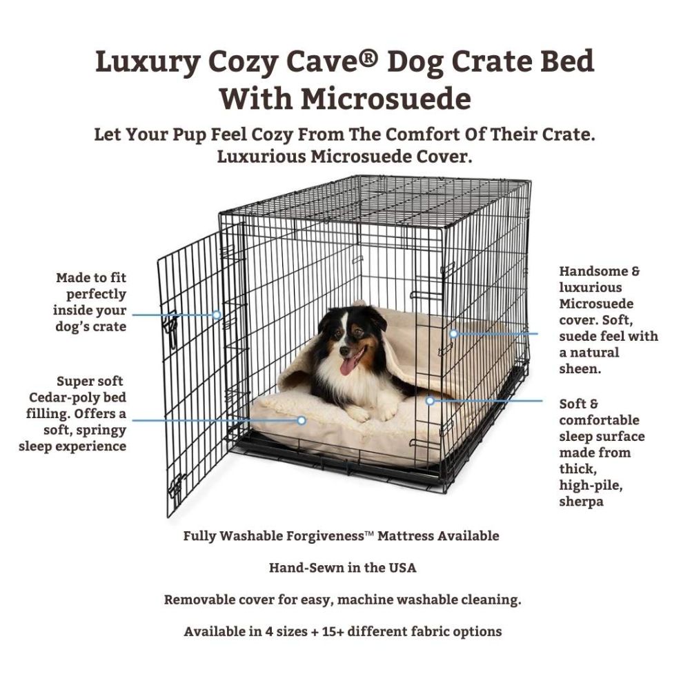 Luxury Cozy Cave® Crate Bed Features: Exterior Fabric: Microsuede Interior Fabric: Sherpa Cleaning & Care: Machine-washable cover....