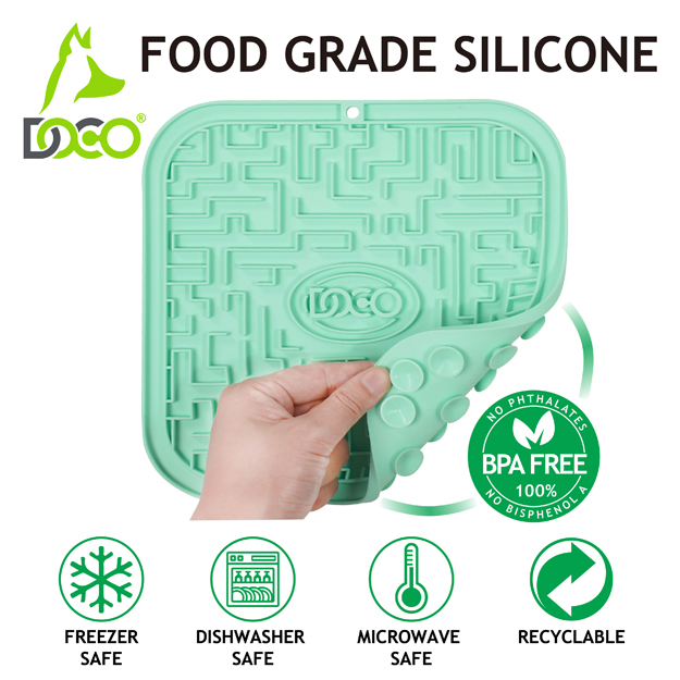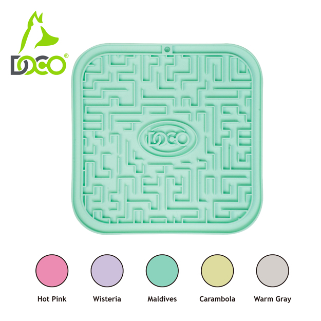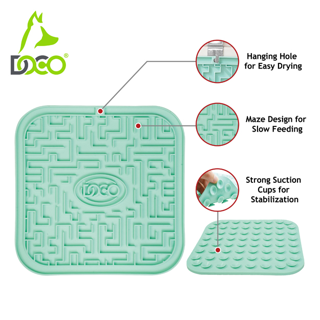The DOCO® Licking Mat is a soothing mat designed to calm and relax pets through the action of licking, making it ideal for stressful situations. It helps dogs alleviate fatigue, anxiety, and destructive behavior. Compatible with a wide range of treats and foods, including yogurt, peanut butter, spreadable treats, raw, wet, dry, and liquid foods, this mat allows your pet to enjoy small portions of food. The maze design promotes slow feeding, encouraging enjoyable licking action that also scrapes food particles off your pet's tongue, contributing to healthier teeth and gums. By slowing down your pet's