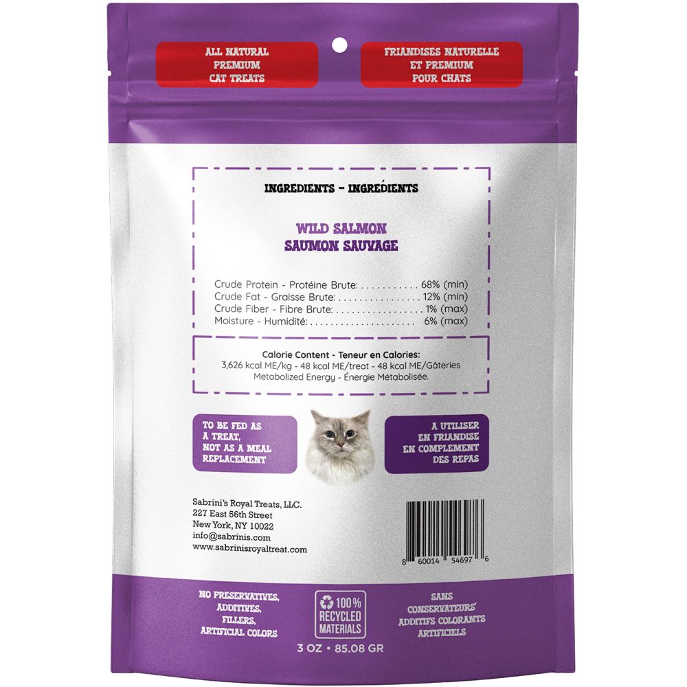 Sometimes our cats don't know the difference between something good for them, like our Sabrini’s 100% natural treats for cats, and things that are...well, not so much. That's why our pets rely on us to help them out! Here at Sabrini's, we use 100% natural and healthy ingredients in our all natural cat treats, as well as making sure our cat treats are properly heated, dried and packaged to ensure quality and safety. Made in Canada, our crispy snacks have 1 or 2 ingredients, depending on the flavor. That's it and that's all. Our premium treats have none of the additives, fillers or preservatives you find in others. They'll surely taste the difference and you'll feel good knowing you're giving your pet the best. You can use Sabrini’s as a snack or for training.