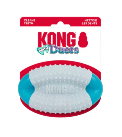 KONG Duets Dental Football brings fun to healthy daily chewing sessions, giving your dog sparkling teeth and a clean tongue for the freshest breath! Perfect for medium to big dogs with a big drive to chew, the raised nubs and dual textures clean while satisfying natural chewing instincts. The easy-to-pick-up shape makes this toy ideal for outdoor games of fetching and retrieving. Try adding doggie toothpaste along the toy for added dental health benefits!