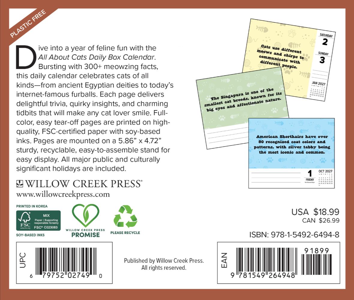 ALL ABOUT CATS – Dive into a year of feline fun with the All About Cats 2027 Daily Box Calendar. Bursting with 300+ meow-zing facts, this daily calendar celebrates cats of all kinds—from ancient Egyptian deities to today’s internet-famous furballs. Each page delivers delightful trivia, quirky insights, and charming tidbits that will make any cat lover smile. DAILY OVERVIEW: Each day is different, so why shouldn't your calendar be? Whether it's humor or scenery, trivia, or quotes, your desk will be the talk of the office from January 2027 to December 2027. Major public and culturally significant holidays are included, helping you stay organized and aware of the day's important events. PICTURE-PERFECT QUALITY – Enjoy vivid, high-quality, full-color images, illustrations, and quotes printed with crisp, bright soy based ink on FSC-certified paper. TABLETOP DISPLAY – Standing 6.2" x 5.4", our daily box calendars merge style with substance to fit perfectly onto any workspace or tabletop. Clean tear-off pages are mounted on a sturdy, easy-to-assemble cardboard easel for effortless display.