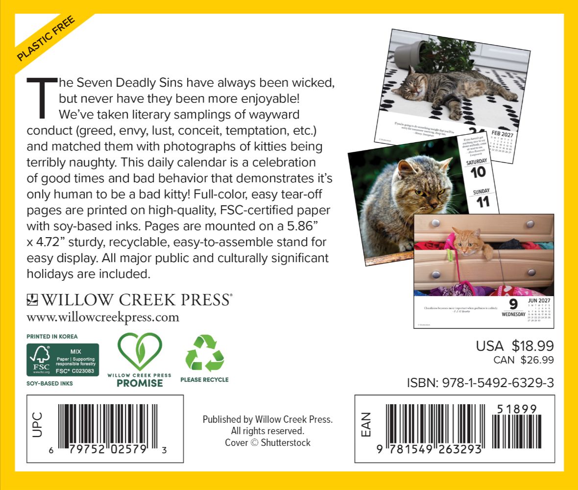 CAT-ASTROPHIC – Get ready to chuckle at naughty cats every day with this desk/box calendar, featuring feline mischief-makers who probably blame you for their antics! DAILY OVERVIEW: Each day is different, so why shouldn't your calendar be? Whether it's humor or scenery, trivia, or quotes, your desk will be the talk of the office from January 2027 to December 2027. Major public and culturally significant holidays are included, helping you stay organized and aware of the day's important events. PICTURE-PERFECT QUALITY – Enjoy vivid, high-quality, full-color images, illustrations, and quotes printed with crisp, bright soy based ink on FSC-certified paper. TABLETOP DISPLAY – Standing 6.2" x 5.4", our daily box calendars merge style with substance to fit perfectly onto any workspace or tabletop. Clean tear-off pages are mounted on a sturdy, easy-to-assemble cardboard easel for effortless display.