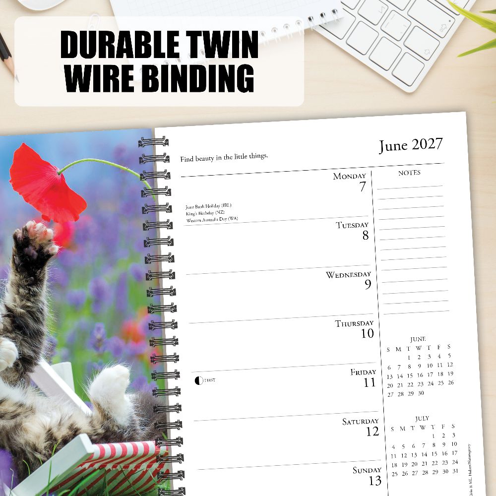 FELINE PHILOSOPHIES – Let these delightful cats teach you the essentials of a fulfilling life through colorful images and insightful text. Learn lessons on grooming, nutrition, and independence inspired by our feline companions with this spiral-bound softcover weekly planner. PLAN IN STYLE – Stay organized in 2027 with our plastic-free 6.5” x 8.5” engagement calendar. Enjoy crisp, colorful imagery throughout, alongside ample space for your weekly plans, notes, and to-do lists. This planner contains 26 full-color images inside (every other week). Its compact size fits easily into bags and purses, ensuring you're always organized on the go. PICTURE-PERFECT QUALITY – Enjoy crisp, colorful photos alongside ample space for your weekly plans, notes, and to-do lists. Plus, it's printed with soy-based inks on high quality paper for smooth writing. SCHEDULE WITH EASE – Be inspired, take notes, remember dates, track appointments, and manage family activities with ease. Our weekly planners offer a practical layout that lets you plan your weeks with efficiency and inspiration.
