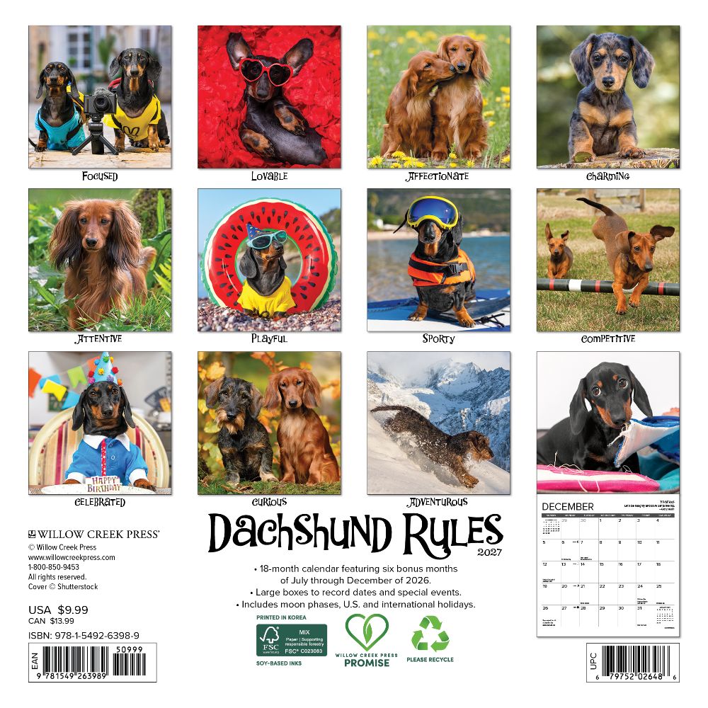LESSONS IN LOYALTY – Enjoy a year highlighted by dazzling photographs of these adored dogs, each paired with life lessons they teach us. PLAN IN STYLE – Our 7” x 7” wall calendars are the perfect fit for small spaces and the modern workplace. Six bonus months from 2026 (July to December) provide a smooth transition into 2027, while monthly grids offer ample room for jotting notes and planning the year ahead. PICTURE-PERFECT QUALITY – Enjoy crisp, colorful monthly photos that double as wall art for your home, office, or school. Plus, it's printed with soy-based inks on high-quality FSC certified paper for smooth writing. SCHEDULE WITH EASE – Be inspired, take notes, remember dates, track appointments, and manage family activities with ease.