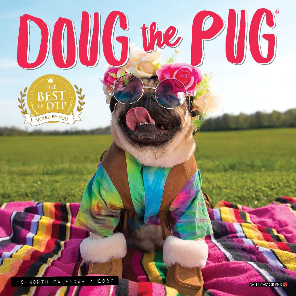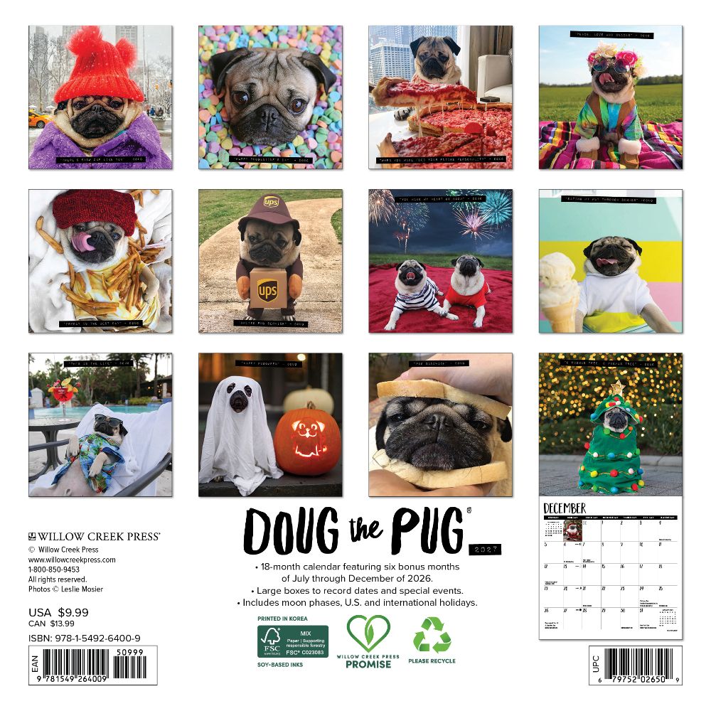 DOUG THE PUG – Meet the "King of Pop Culture" with 18 million social media followers and billions of video views. Doug loves the camera as much as the camera loves him! PLAN IN STYLE – Our 7” x 7” wall calendars are the perfect fit for small spaces and the modern workplace. Six bonus months from 2026 (July to December) provide a smooth transition into 2027, while monthly grids offer ample room for jotting notes and planning the year ahead. PICTURE-PERFECT QUALITY – Enjoy crisp, colorful monthly photos that double as wall art for your home, office, or school. Plus, it's printed with soy-based inks on high-quality FSC certified paper for smooth writing. SCHEDULE WITH EASE – Be inspired, take notes, remember dates, track appointments, and manage family activities with ease.