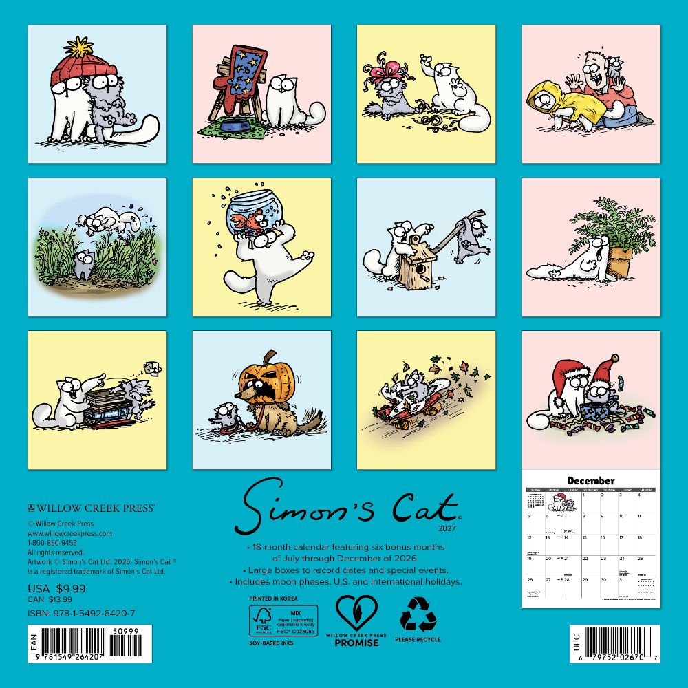 ANIMATED ANTICS – Simon's Cat, a YouTube sensation, is all about the mischiefs of a chunky house cat, his doting owner Simon, and the various characters they meet. PLAN IN STYLE – Our 7” x 7” wall calendars are the perfect fit for small spaces and the modern workplace. Six bonus months from 2026 (July to December) provide a smooth transition into 2027, while monthly grids offer ample room for jotting notes and planning the year ahead. PICTURE-PERFECT QUALITY – Enjoy crisp, colorful monthly photos that double as wall art for your home, office, or school. Plus, it's printed with soy-based inks on high-quality FSC certified paper for smooth writing. SCHEDULE WITH EASE – Be inspired, take notes, remember dates, track appointments, and manage family activities with ease.