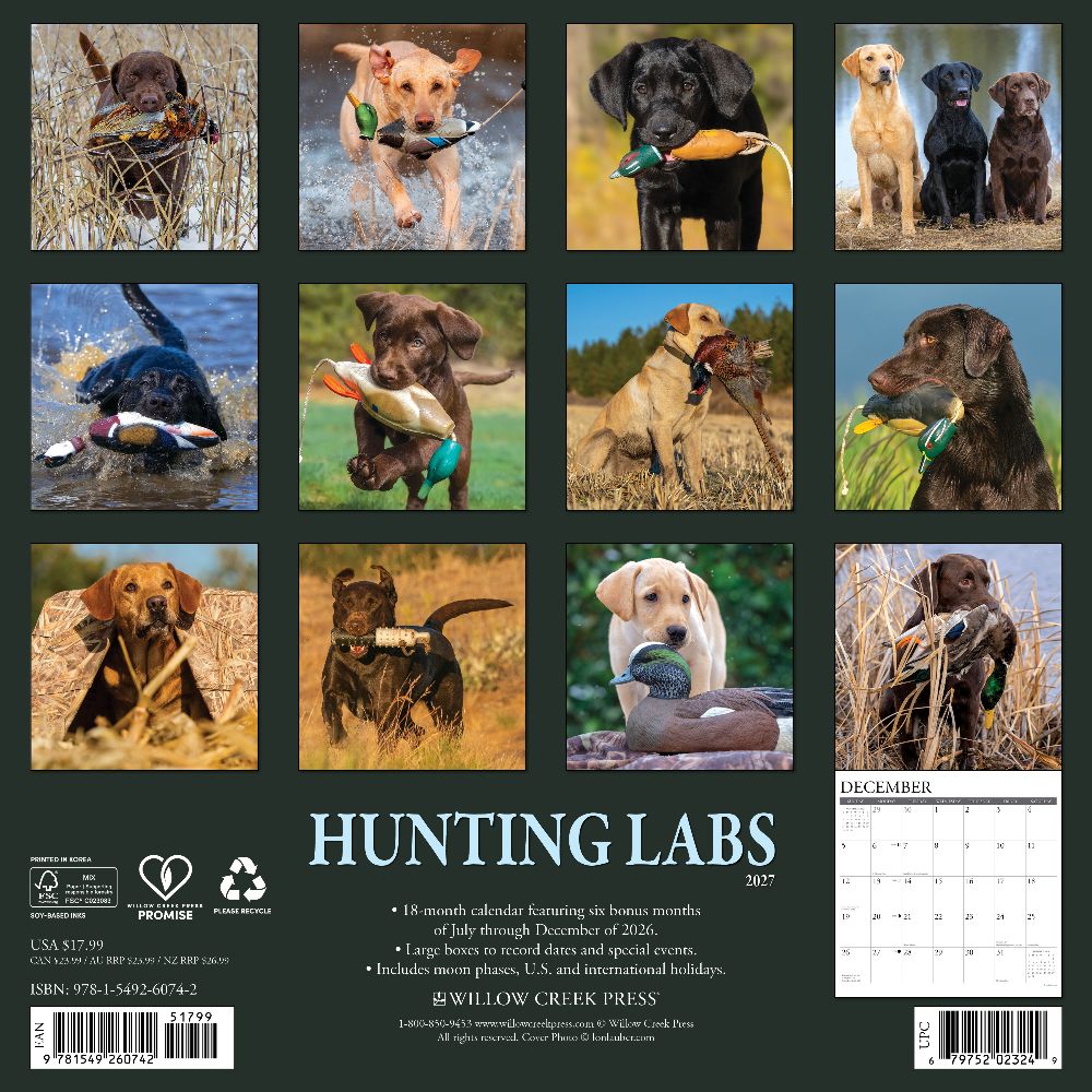 SPORTING COMPANIONS – The Hunting Labs 2027 calendar showcases the intelligence, loyalty, and athleticism of Labrador Retrievers in action. Whether retrieving in the field or posing in crisp autumn light, these working dogs embody the heart of the hunt. PLAN IN STYLE – Stay organized with our 12” x 12” monthly wall calendars, the perfect fit for any home or modern office. Six bonus months from July to December 2026 provide a smooth transition into the new year, while large monthly grids from January through December 2027 offer ample room for jotting notes and planning. PICTURE-PERFECT QUALITY – Printed with soy-based inks on high-quality FSC-certified paper, our large format 12” x 12” wall calendars offer smooth writing, crisp readability, and vibrant imagery, making them a welcome accent to any space. EFFORTLESS SCHEDULING – Enjoy ample space to note events, track appointments, and easily organize activities. Manage busy schedules at-a-glance with clearly noted moon phases (CST), holidays, and observances.