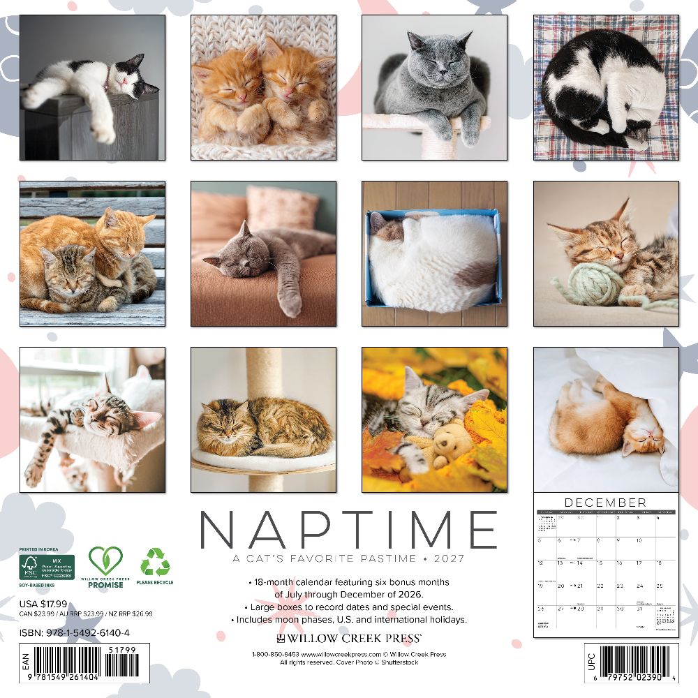 CATNAP CUTENESS – The Naptime 2027 calendar captures the irresistible charm of snoozing kittens in their most peaceful and adorable moments, making every month a cozy cuddle-fest. Ideal for cat lovers who know that a good nap is truly an art form. PLAN IN STYLE – Stay organized with our 12” x 12” monthly wall calendars, the perfect fit for any home or modern office. Six bonus months from July to December 2026 provide a smooth transition into the new year, while large monthly grids from January through December 2027 offer ample room for jotting notes and planning. PICTURE-PERFECT QUALITY – Printed with soy-based inks on high-quality FSC-certified paper, our large format 12” x 12” wall calendars offer smooth writing, crisp readability, and vibrant imagery, making them a welcome accent to any space. EFFORTLESS SCHEDULING – Enjoy ample space to note events, track appointments, and easily organize activities. Manage busy schedules at-a-glance with clearly noted moon phases (CST), holidays, and observances.