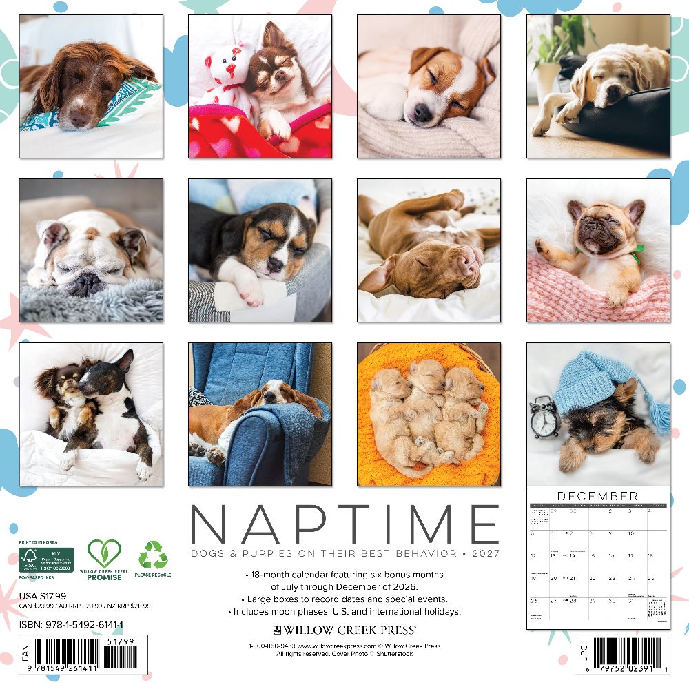 DOGGONE DREAMY – The Naptime: Dogs & Puppies on Their Best Behavior 2027 calendar brings twelve months of pure puppy peace, featuring adorable canines curled up and catching some Z's. Perfect for dog lovers who believe nap time is the cutest time. PLAN IN STYLE – Stay organized with our 12” x 12” monthly wall calendars, the perfect fit for any home or modern office. Six bonus months from July to December 2026 provide a smooth transition into the new year, while large monthly grids from January through December 2027 offer ample room for jotting notes and planning. PICTURE-PERFECT QUALITY – Printed with soy-based inks on high-quality FSC-certified paper, our large format 12” x 12” wall calendars offer smooth writing, crisp readability, and vibrant imagery, making them a welcome accent to any space. EFFORTLESS SCHEDULING – Enjoy ample space to note events, track appointments, and easily organize activities. Manage busy schedules at-a-glance with clearly noted moon phases (CST), holidays, and observances.