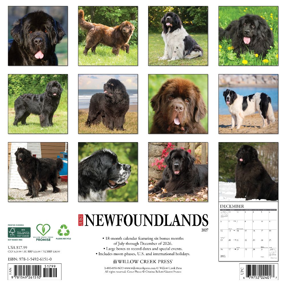 GENTLE GIANTS – The 2027 Just Newfoundlands Wall Calendar celebrates the majestic beauty and sweet nature of one of the most beloved large breeds. From beach strolls to backyard lounging, each image captures the heart-melting charm of these loyal, lovable dogs. PLAN IN STYLE – Stay organized with our 12” x 12” monthly wall calendars, the perfect fit for any home or modern office. Six bonus months from July to December 2026 provide a smooth transition into the new year, while large monthly grids from January through December 2027 offer ample room for jotting notes and planning. PICTURE-PERFECT QUALITY – Printed with soy-based inks on high-quality FSC-certified paper, our large format 12” x 12” wall calendars offer smooth writing, crisp readability, and vibrant imagery, making them a welcome accent to any space. EFFORTLESS SCHEDULING – Enjoy ample space to note events, track appointments, and easily organize activities. Manage busy schedules at-a-glance with clearly noted moon phases (CST), holidays, and observances.