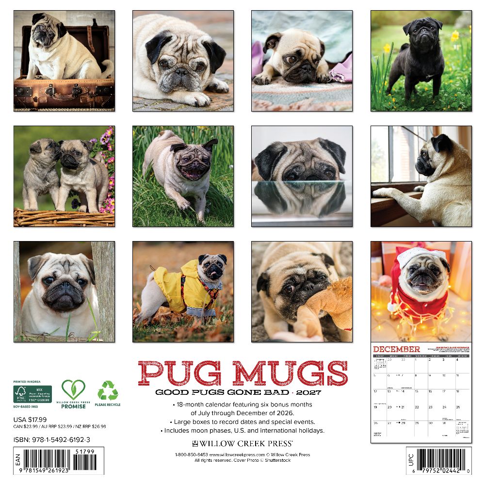 TOO CUTE TO CONVICT – These mischievous pugs may look like criminals, but their adorable antics will have you smiling all year long in this hilariously themed Pug Mugs 2027 calendar. With each month featuring a new “charge” and costume, it’s the perfect gift for dog lovers who enjoy a good laugh. PLAN IN STYLE – Stay organized with our 12” x 12” monthly wall calendars, the perfect fit for any home or modern office. Six bonus months from July to December 2026 provide a smooth transition into the new year, while large monthly grids from January through December 2027 offer ample room for jotting notes and planning. PICTURE-PERFECT QUALITY – Printed with soy-based inks on high-quality FSC-certified paper, our large format 12” x 12” wall calendars offer smooth writing, crisp readability, and vibrant imagery, making them a welcome accent to any space. EFFORTLESS SCHEDULING – Enjoy ample space to note events, track appointments, and easily organize activities. Manage busy schedules at-a-glance with clearly noted moon phases (CST), holidays, and observances.