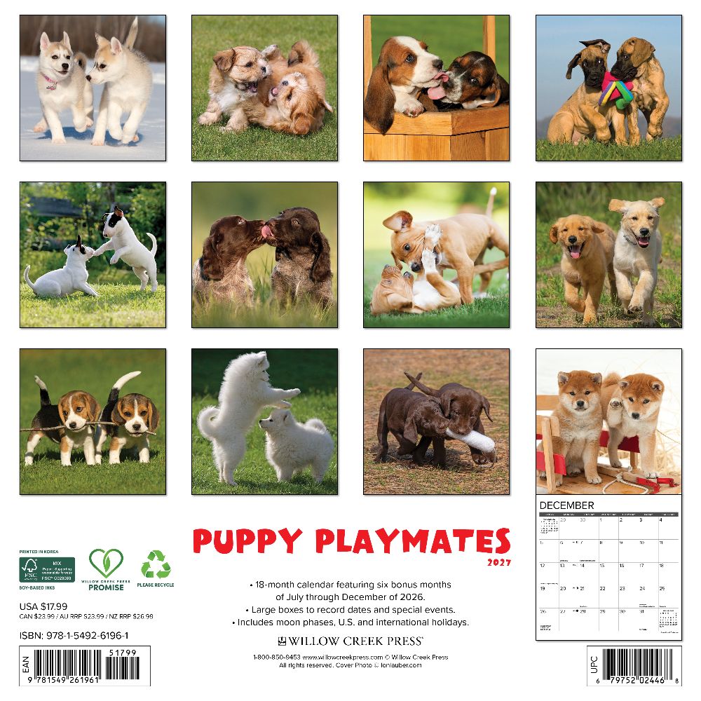 DOUBLE THE CUTE – Celebrate the joy of puppy friendships with this heart-melting 2027 calendar featuring playful pairs and furry duos at their most adorable. Each month brings a new snapshot of sweet companionship that will brighten your days year-round. PLAN IN STYLE – Stay organized with our 12” x 12” monthly wall calendars, the perfect fit for any home or modern office. Six bonus months from July to December 2026 provide a smooth transition into the new year, while large monthly grids from January through December 2027 offer ample room for jotting notes and planning. PICTURE-PERFECT QUALITY – Printed with soy-based inks on high-quality FSC-certified paper, our large format 12” x 12” wall calendars offer smooth writing, crisp readability, and vibrant imagery, making them a welcome accent to any space. EFFORTLESS SCHEDULING – Enjoy ample space to note events, track appointments, and easily organize activities. Manage busy schedules at-a-glance with clearly noted moon phases (CST), holidays, and observances.