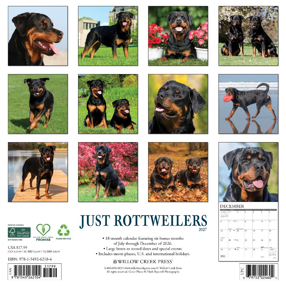 POWERFUL COMPANIONS – The 2027 Just Rottweilers calendar captures the bold spirit and loving loyalty of this majestic breed in stunning full-color photography. From playful moments to regal poses, each image celebrates the strength and affection of these beloved dogs. PLAN IN STYLE – Stay organized with our 12” x 12” monthly wall calendars, the perfect fit for any home or modern office. Six bonus months from July to December 2026 provide a smooth transition into the new year, while large monthly grids from January through December 2027 offer ample room for jotting notes and planning. PICTURE-PERFECT QUALITY – Printed with soy-based inks on high-quality FSC-certified paper, our large format 12” x 12” wall calendars offer smooth writing, crisp readability, and vibrant imagery, making them a welcome accent to any space. EFFORTLESS SCHEDULING – Enjoy ample space to note events, track appointments, and easily organize activities. Manage busy schedules at-a-glance with clearly noted moon phases (CST), holidays, and observances.