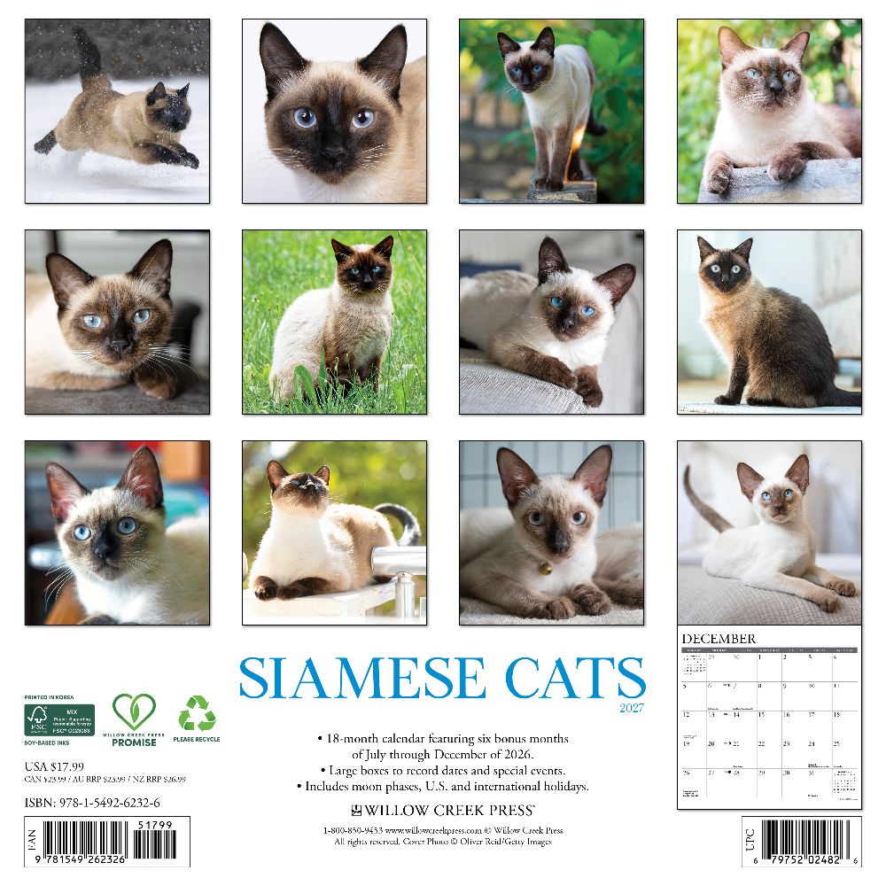 STRIKING BEAUTY – The Siamese Cats 2027 calendar features the captivating allure of these elegant felines, known for their sleek coats and brilliant blue eyes. Each month showcases their graceful charm, playful personalities, and photogenic poise. PLAN IN STYLE – Stay organized with our 12” x 12” monthly wall calendars, the perfect fit for any home or modern office. Six bonus months from July to December 2026 provide a smooth transition into the new year, while large monthly grids from January through December 2027 offer ample room for jotting notes and planning. PICTURE-PERFECT QUALITY – Printed with soy-based inks on high-quality FSC-certified paper, our large format 12” x 12” wall calendars offer smooth writing, crisp readability, and vibrant imagery, making them a welcome accent to any space. EFFORTLESS SCHEDULING – Enjoy ample space to note events, track appointments, and easily organize activities. Manage busy schedules at-a-glance with clearly noted moon phases (CST), holidays, and observances.