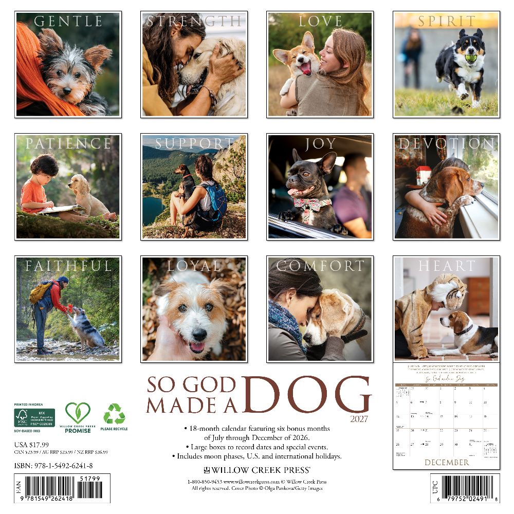 DIVINE COMPANIONSHIP – The So God Made a Dog 2027 calendar is a heartwarming tribute to the unwavering love, loyalty, and joy that dogs bring into our lives. Each month celebrates the soulful bond between humans and their four-legged angels with inspiring imagery and words. PLAN IN STYLE – Stay organized with our 12” x 12” monthly wall calendars, the perfect fit for any home or modern office. Six bonus months from July to December 2026 provide a smooth transition into the new year, while large monthly grids from January through December 2027 offer ample room for jotting notes and planning. PICTURE-PERFECT QUALITY – Printed with soy-based inks on high-quality FSC-certified paper, our large format 12” x 12” wall calendars offer smooth writing, crisp readability, and vibrant imagery, making them a welcome accent to any space. EFFORTLESS SCHEDULING – Enjoy ample space to note events, track appointments, and easily organize activities. Manage busy schedules at-a-glance with clearly noted moon phases (CST), holidays, and observances.