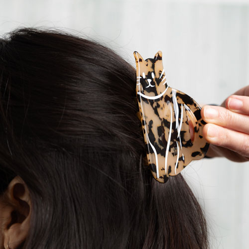 Show off your love for cats with Pearhead’s adorable Cat Hair Clip, a stylish and eye-catching accessory designed for women, teens, and girls who adore their feline friends. Crafted in a classic tortoise shell pattern, this cat-shaped barrette features a sweet sitting kitty silhouette with etched details that add personality and charm to any hairstyle. Its warm marbled acetate design blends effortlessly with casual outfits, everyday looks, or special occasions, giving you a fun and fashionable way to incorporate your love for animals into your style. Made from premium acetate, this cat clip is lightweight, durable, and gentle on your hair. Its smooth finish and secure grip make it ideal for clipping back bangs, holding small sections, or adding a decorative touch to half-up hairstyles. Whether your hair is fine or thick, curly or straight, this cute animal hair accessory offers reliable hold without tugging, pulling, or slipping. A perfect gift for cat moms, pet lovers, or anyone who can’t resist unique hair accessories, this tortoise shell cat barrette makes a delightful addition to gift baskets, stocking stuffers, birthday surprises, and back-to-school essentials. It’s also a great everyday accessory for work, school, brunch, or simply adding a playful touch to your daily look. Fun, fashionable, and full of personality, Pearhead’s Cat Hair Clip is the must-have accessory for every cat lover looking to add a trendy, animal-inspired accent to their hairstyle.