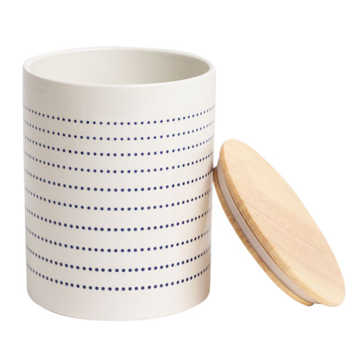 Keep your dog’s favorite treats fresh and beautifully stored with this modern ceramic dog treat jar featuring a clean navy blue dot pattern and natural wooden lid. Designed for everyday pet treat storage, this durable stoneware container is perfect for dog biscuits, puppy treats, and training rewards. The wood lid helps protect freshness while the sturdy ceramic construction provides a premium non-plastic alternative to traditional pet treat containers. With its minimalist dotted design, this decorative dog treat jar blends seamlessly into farmhouse, coastal, and contemporary kitchens while keeping your pet’s snacks conveniently organized on the countertop or in the pantry. A functional and stylish addition to any pet feeding station. Size: Measures 4.9″ W × 6.25″ H. Holds up to 4 cups (32 oz) of treats