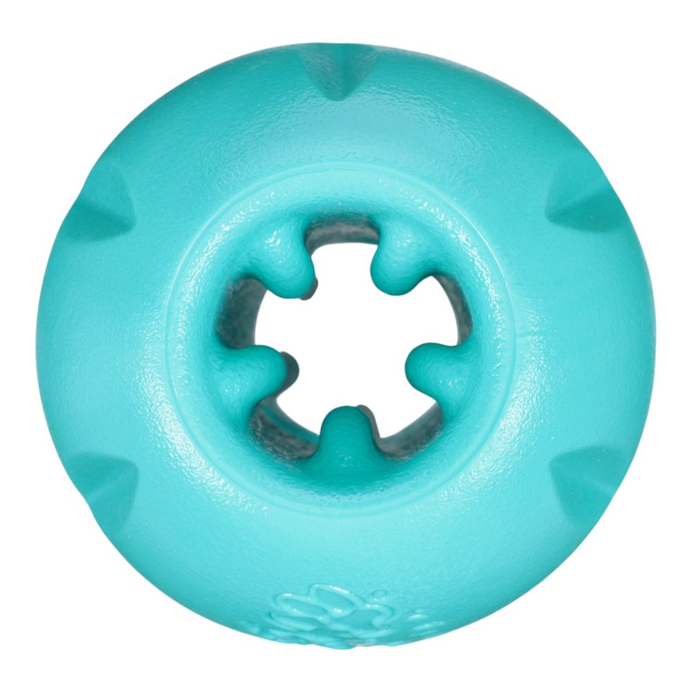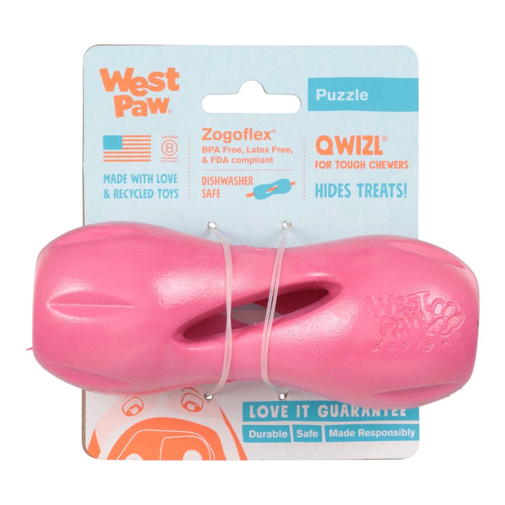 This award-winning, eco-friendly puzzle and treat toy was brilliantly designed to extend the life of expensive dog treats while keeping dogs busy. The side openings release scent and taste while the continuous interior hole allows treats to extend out. Flexible ridges grip multiple sizes of treats. One of our toughest dog toys, Qwizl is also fun to toss, fetch, and chew even after the treats are gone. Curved shape makes toy easy for dogs to hold in place with paws.
