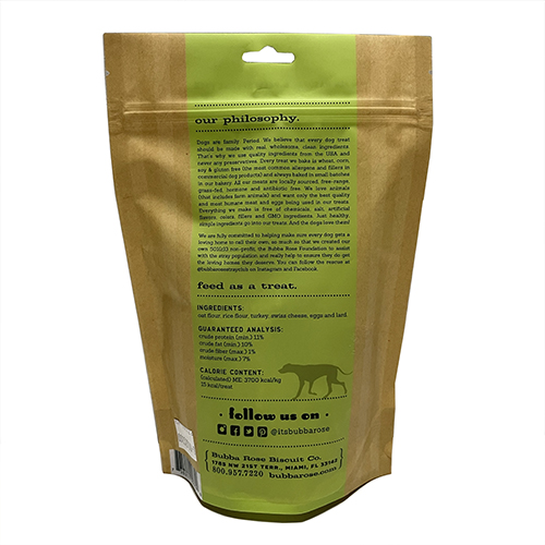 These turkey and swiss biscuits are great for dogs with sensitive stomachs, as turkey is an easier protein for a lot of dogs. You can feel good knowing that we care about farm animals as much as dogs and we only use free-range turkey in our treats. They come in our resealable zipper bags for convenience.