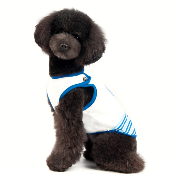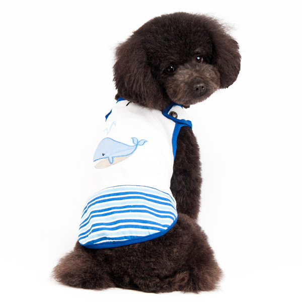 Multi blue striped tank with an adorable whale embroidered patch. 100% stretch cotton with convenient leash hole.