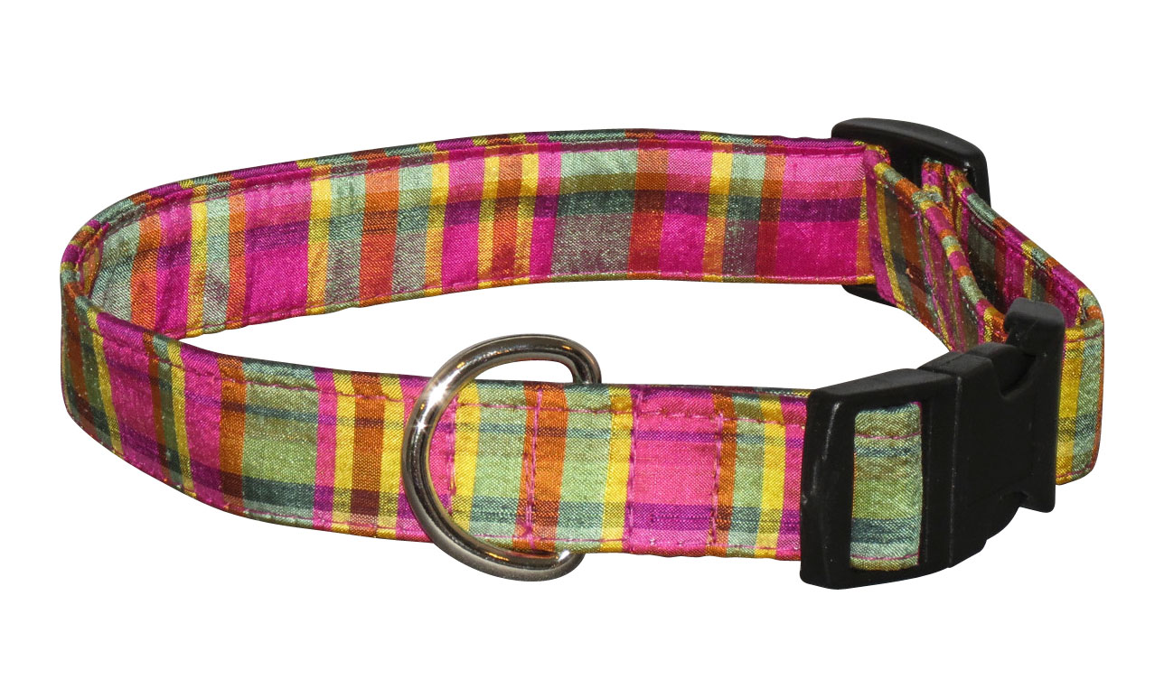 Standard Dog Collars: These collars have a contoured side release buckle for easily putting the collar on and off the dog. They also have an adjustment slide and a d-ring for ID tags and connecting the lead. They are available in 3/8", 1/2", 3/4", 1" and 1 1/2" (custom) widths. The 3/8" and 1/2" collars have a cotton interior webbing, the 3/4" collars have a lightweight polypropylene interior webbing, and the 1" and 1 1/2" collars have a heavyweight polypropylene interior webbing.